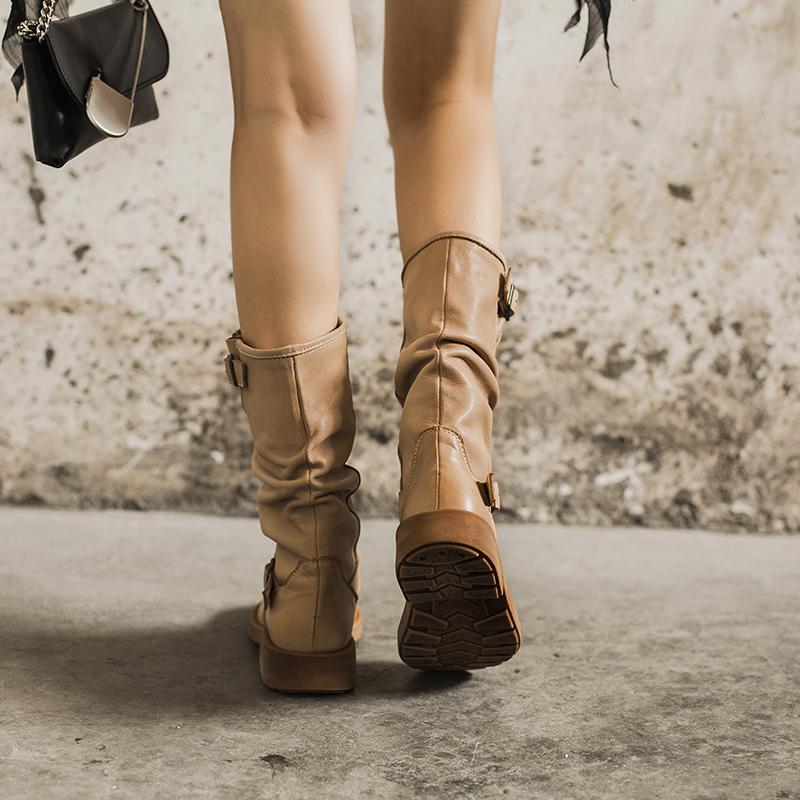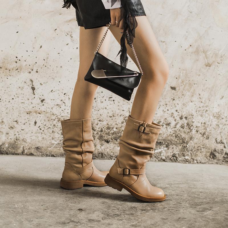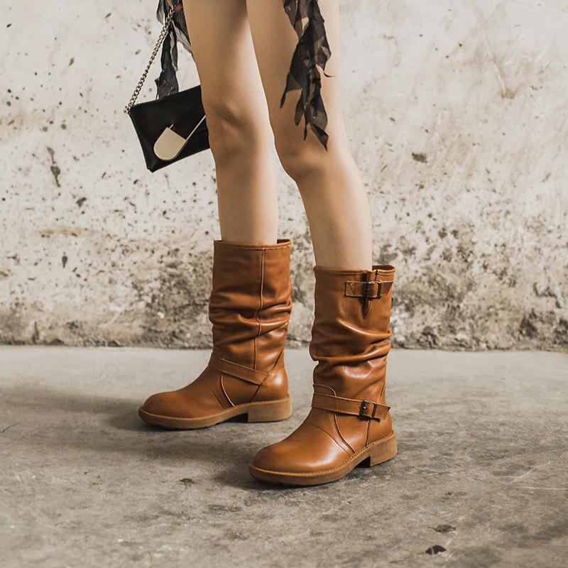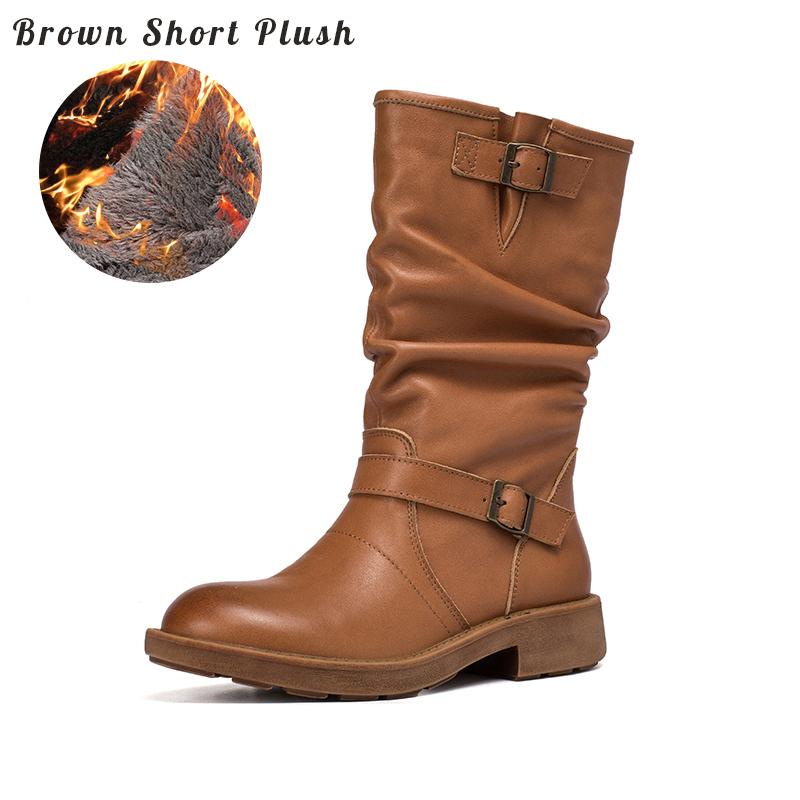 Waxing Leather Mid Calf Boots Fold Design Riding Boots Short Plush Lined Or Leather For Choice Apricot/Brown/Black