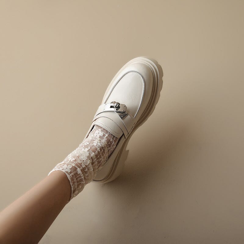 Chunky Loafers Women Smooth Genuine Leather Platform Shoes Round Toe Metal Chain Details