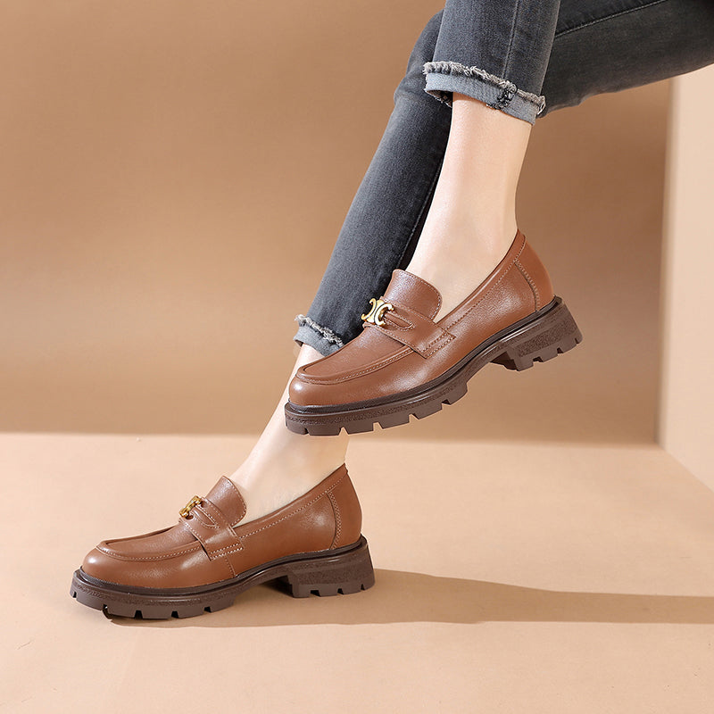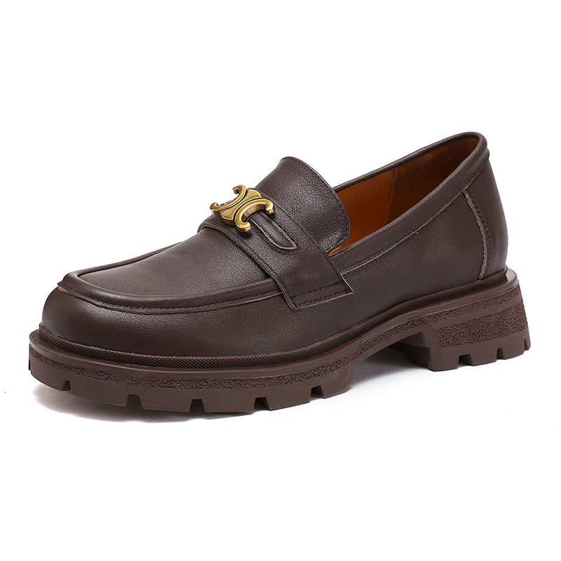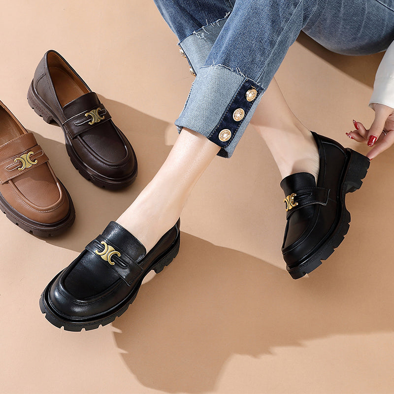 Leather Metal Buckle Platform Loafers For Women In Black/Coffee/Camel/Dark Coffee