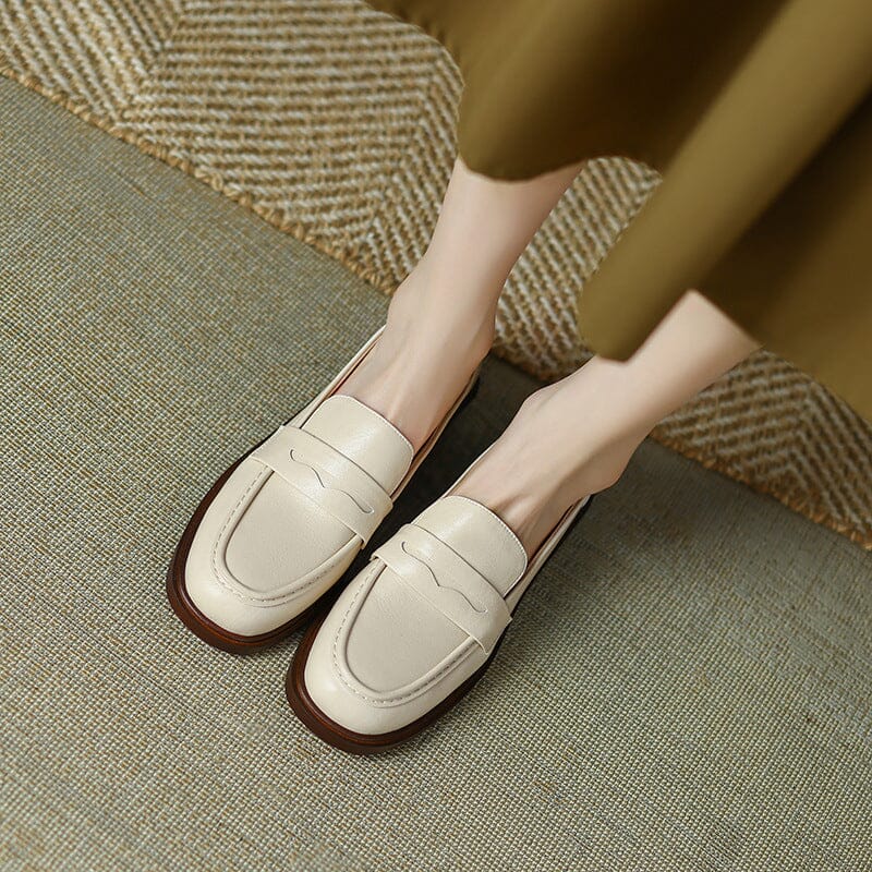 Handmade Cow leather Penny Loafers For Women Retro Block Heel in Green/Black/Beige/Brown