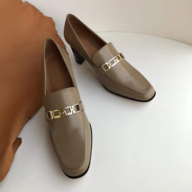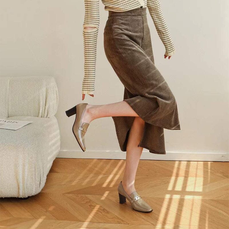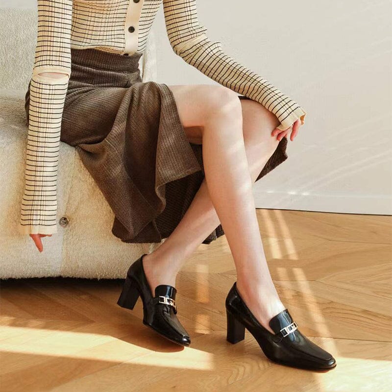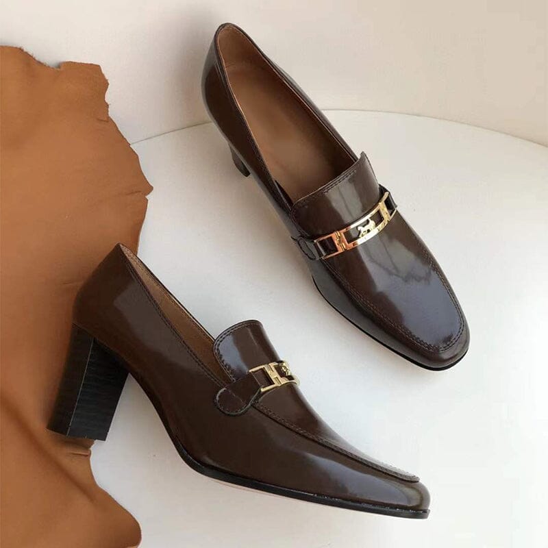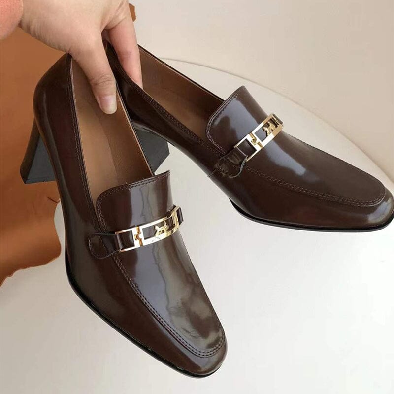 Women's Handmade Retro Square-Toe Blok-Heel Loafers in Black/Coffee/Khaki