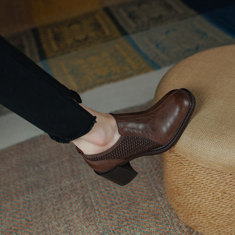 Womens Handmade Retro Round Toe Block Heel Pumps in Black/Coffee