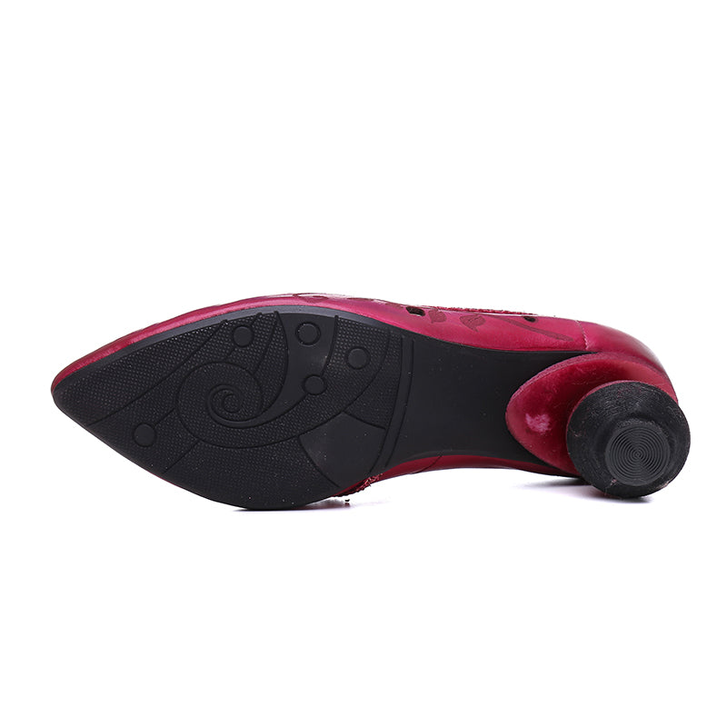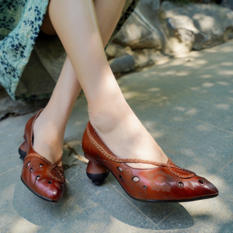 Handmade brush-off leather with ingenious stamped plums,delicate shoelace, elegant mid-heel pumps, classic pointed toe.