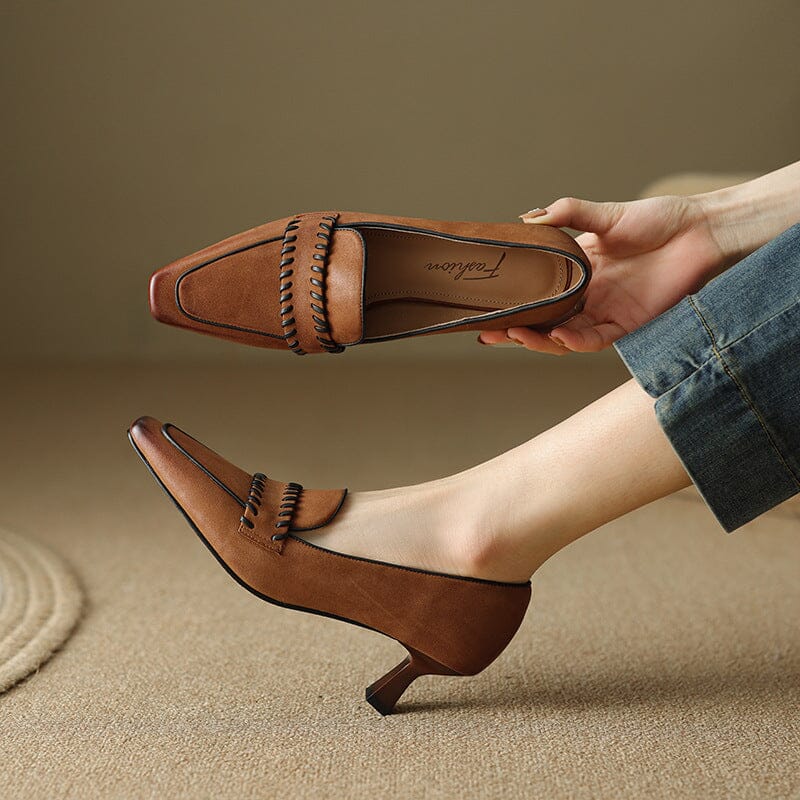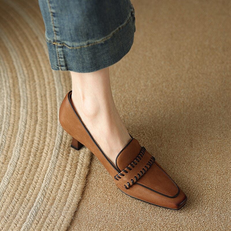 Womens Handmade Leather Square Toe Kitty Heel Slip On Pumps in Brown/Khaki