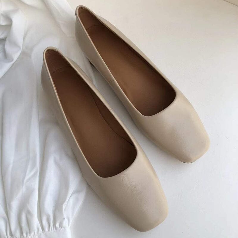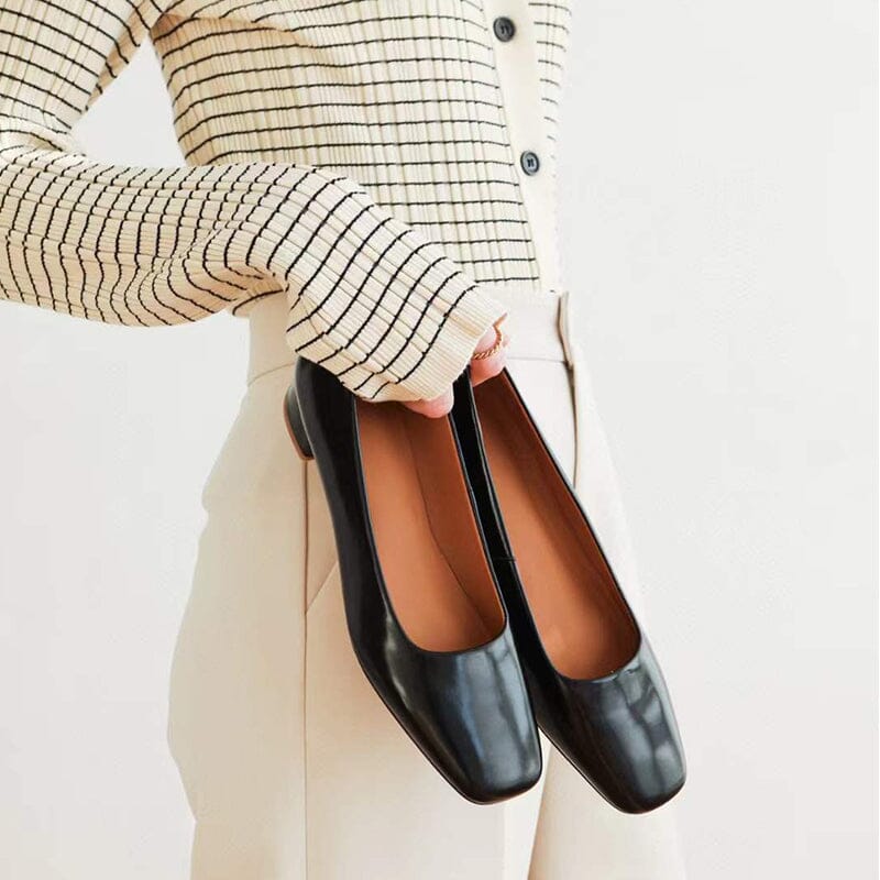 Leather Square Toe Block Heeled Slip-On Pumps Office Shoes in Beige/Black/Khaki