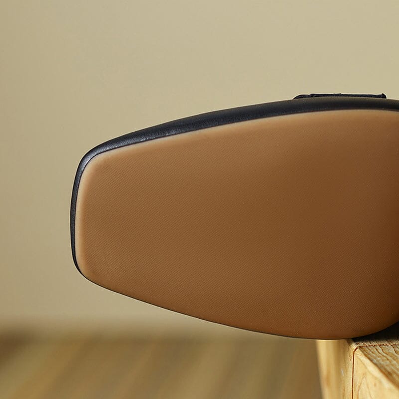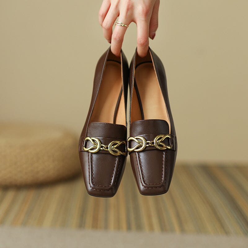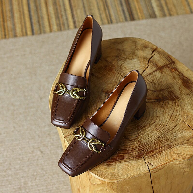 Womens Handmade Retro Square-Toe Blok-Heel Loafers Chain-Link Detail in Black/Brown