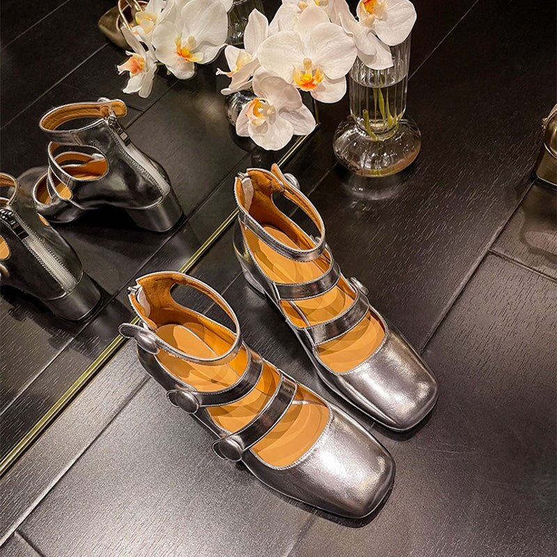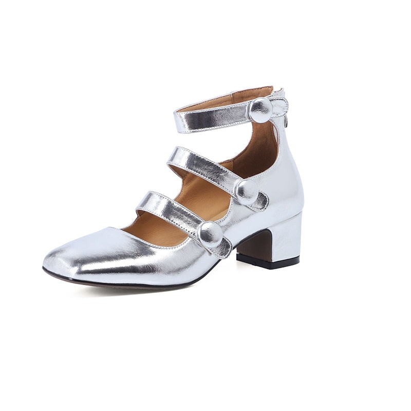 Retro Leather 50mm Triple-strap Mary Jane Pumps Block Heel Square Toe in Golden/Silver