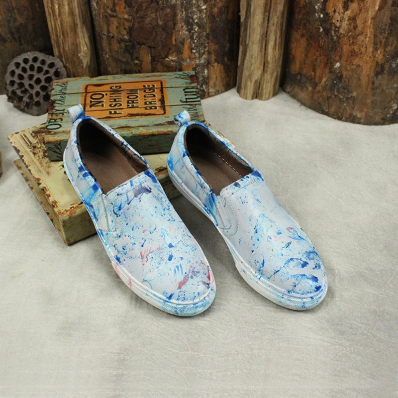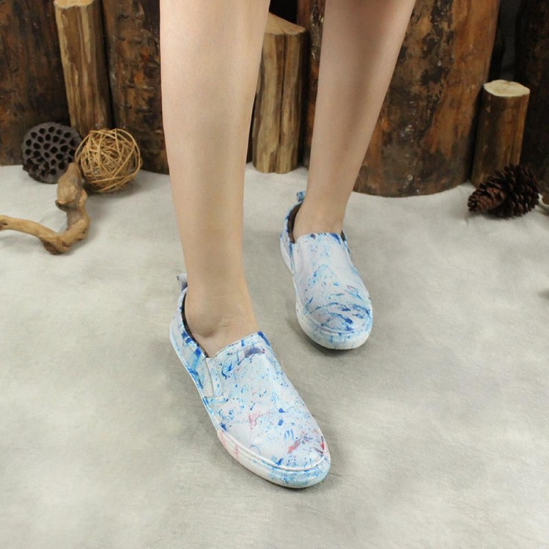 Women'S Sneakers Handmade Casual Flat Shoes Soft Leather Loafers Blue