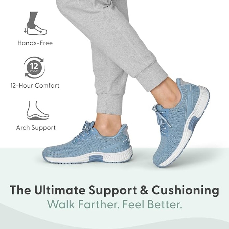 • Women's orthopedic sneakers with patented slip-on technology and a revolutionary heel design that keeps footwear from slipping off unexpectedly.