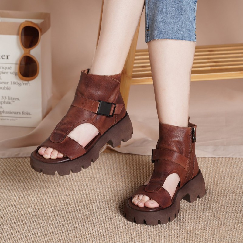 Genuine Leather Platform Sandals Boots For Women Peep Toe Buckle Sandals Side Zipper BlackNew/BrownNew/Black/Brown