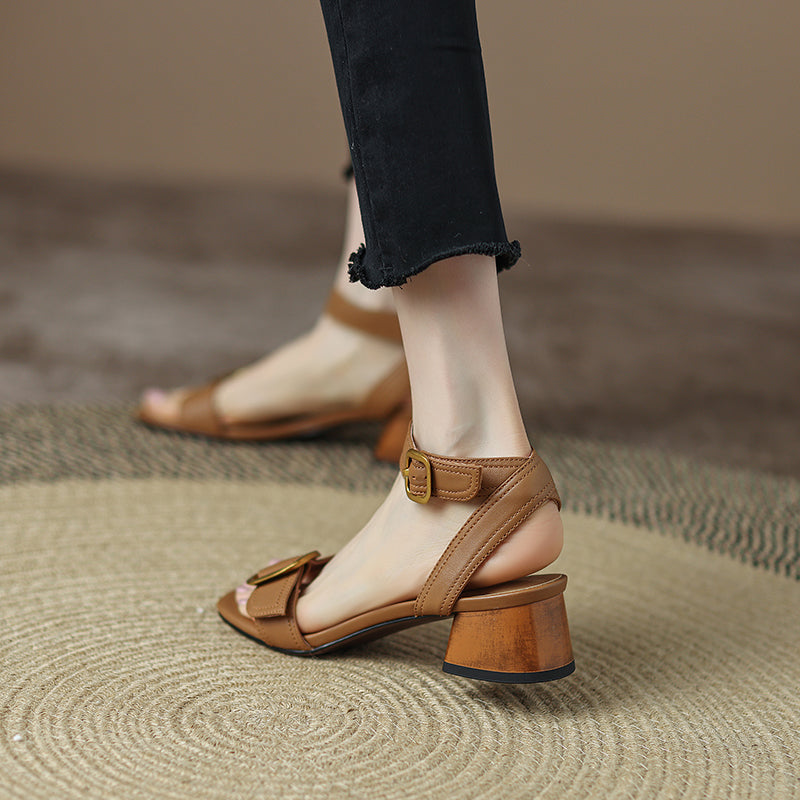Block Heel Leather sandal Buckle Sandals in Beige/Brown