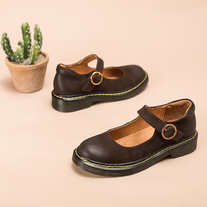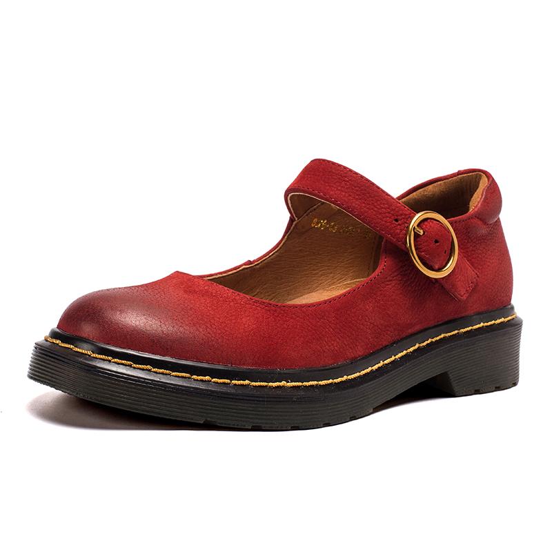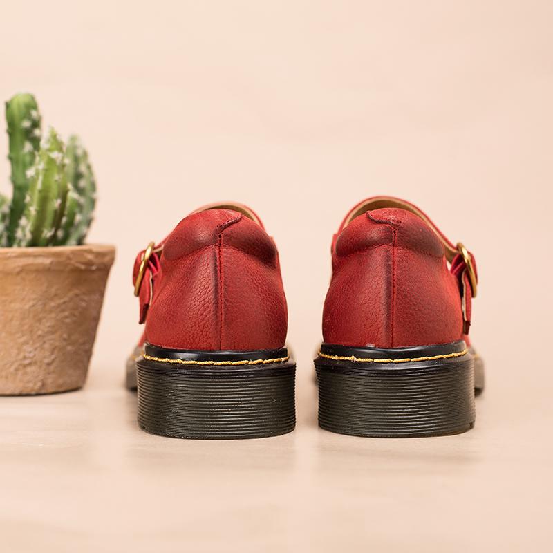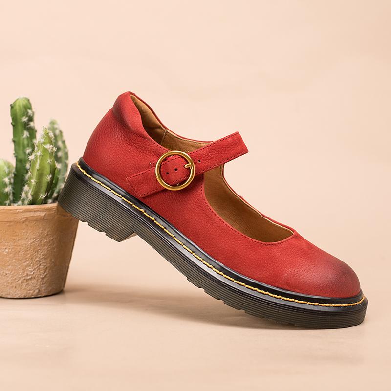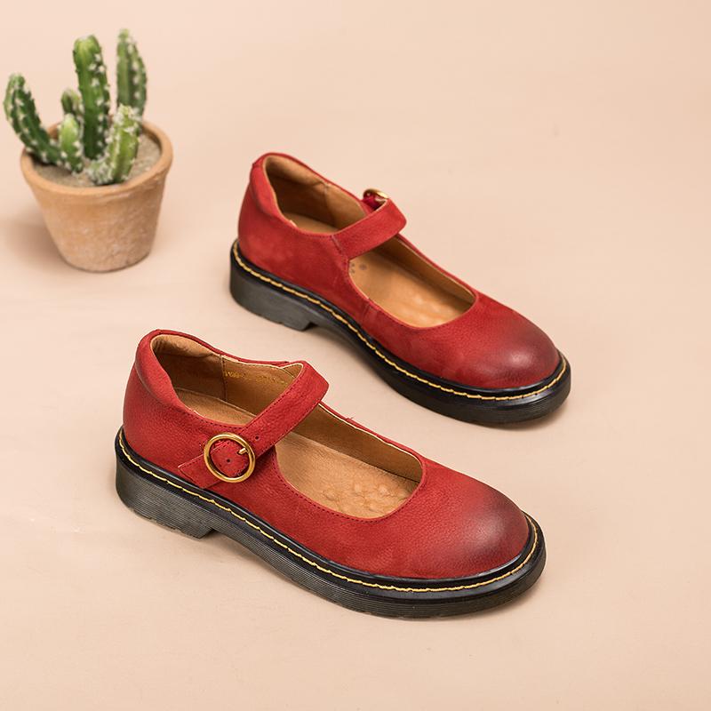 Handmade Retro Matte Leather Flat Mary Jane Shoes For Womens Round Toe Red/Brown/Coffee