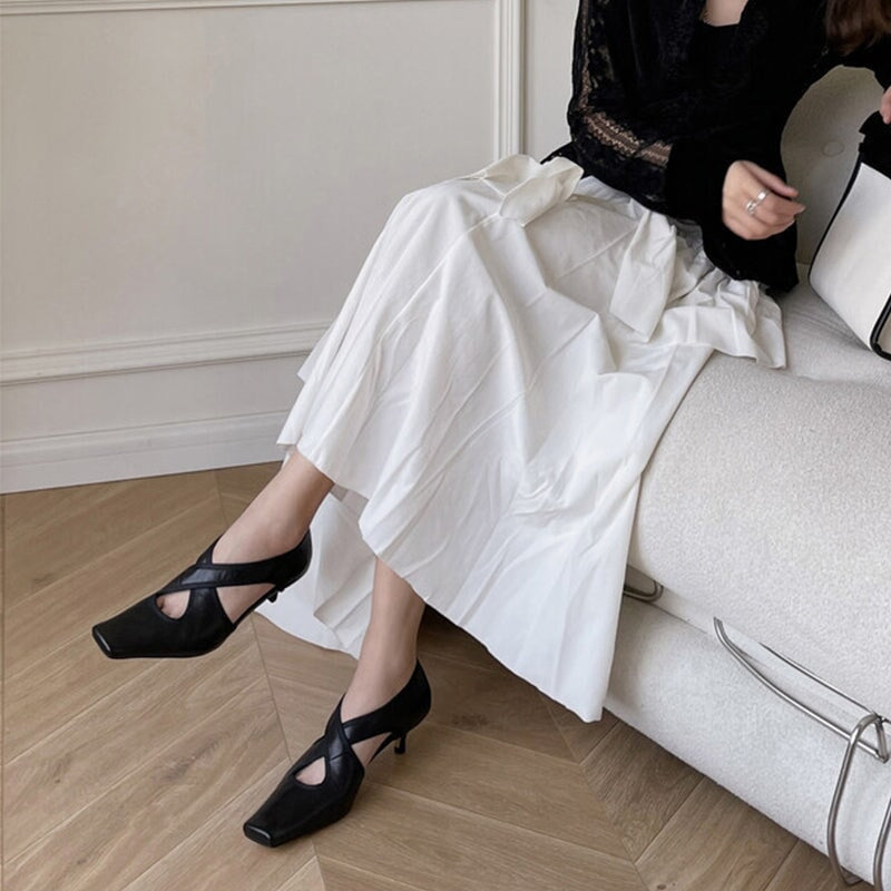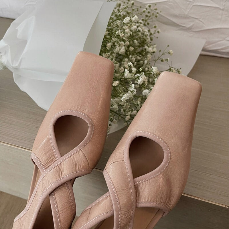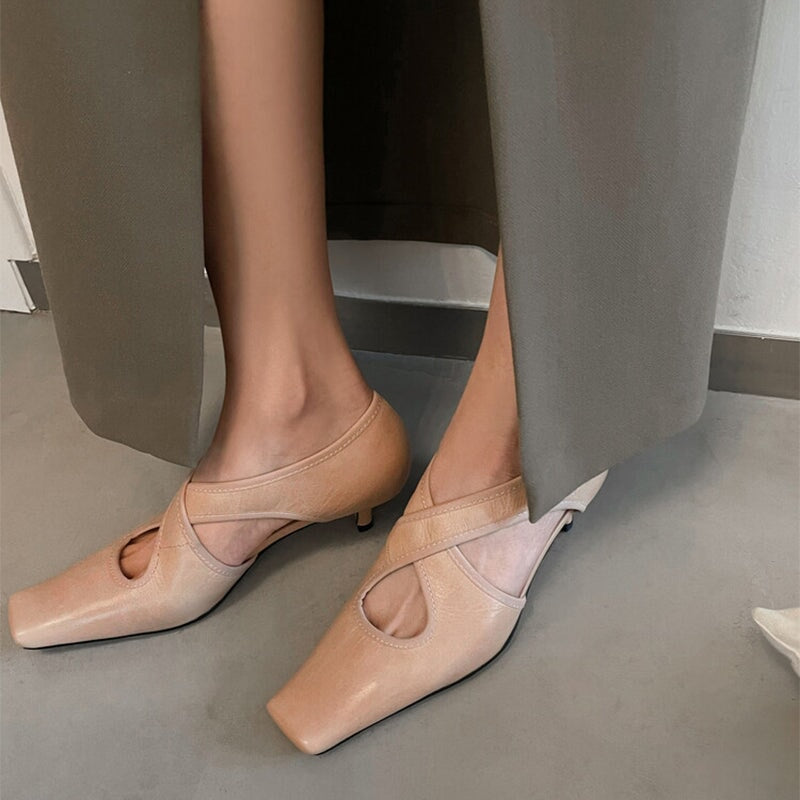 Handmade Soft Leather Kitty Heel Cross Strap Pumps in Pink/Black