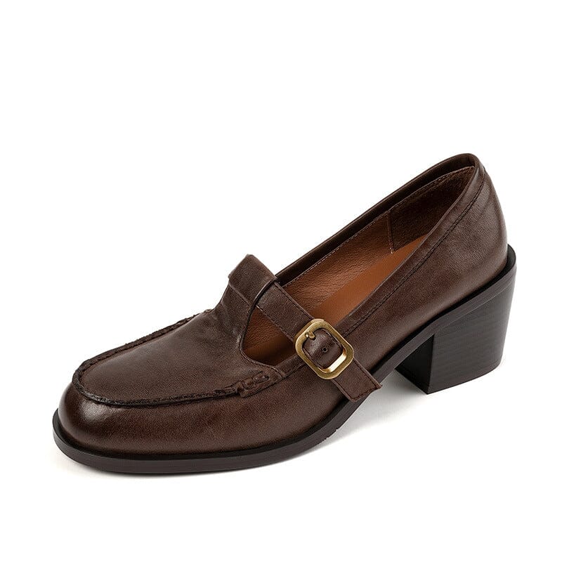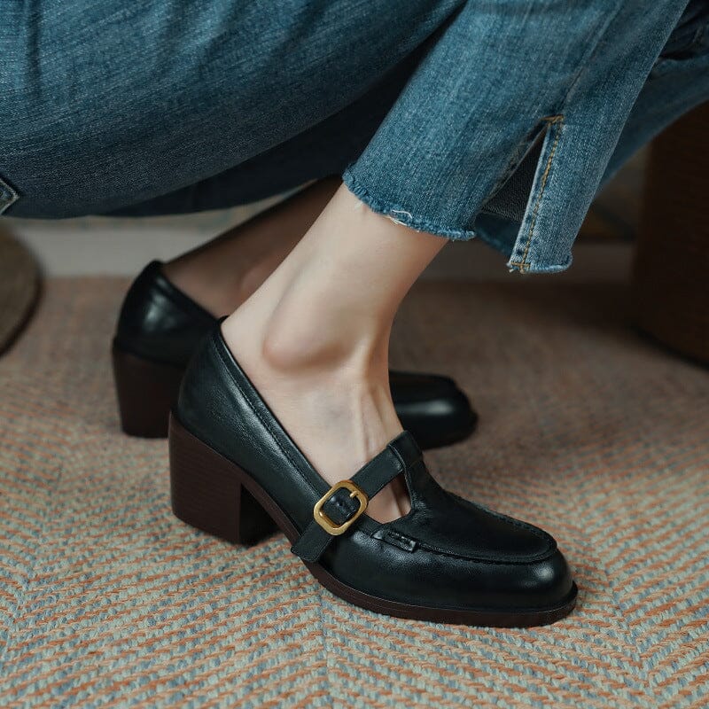 Handmade Leather Pumps T Strap Buckle Mary Jane Heels Sandals Womens Round Toe in Black/Coffee