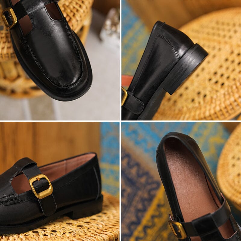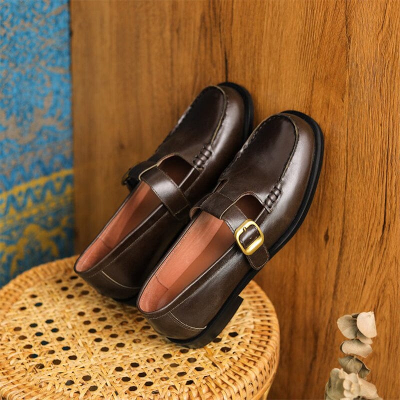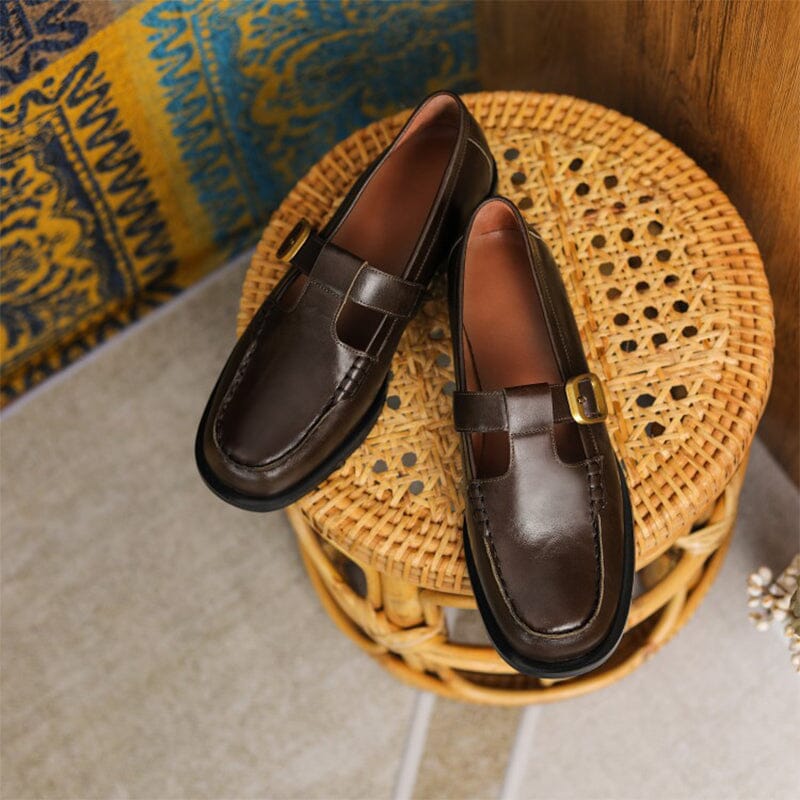 Leather T-strap Mary Jane Shoes For Women Round Toe in Black/Brown