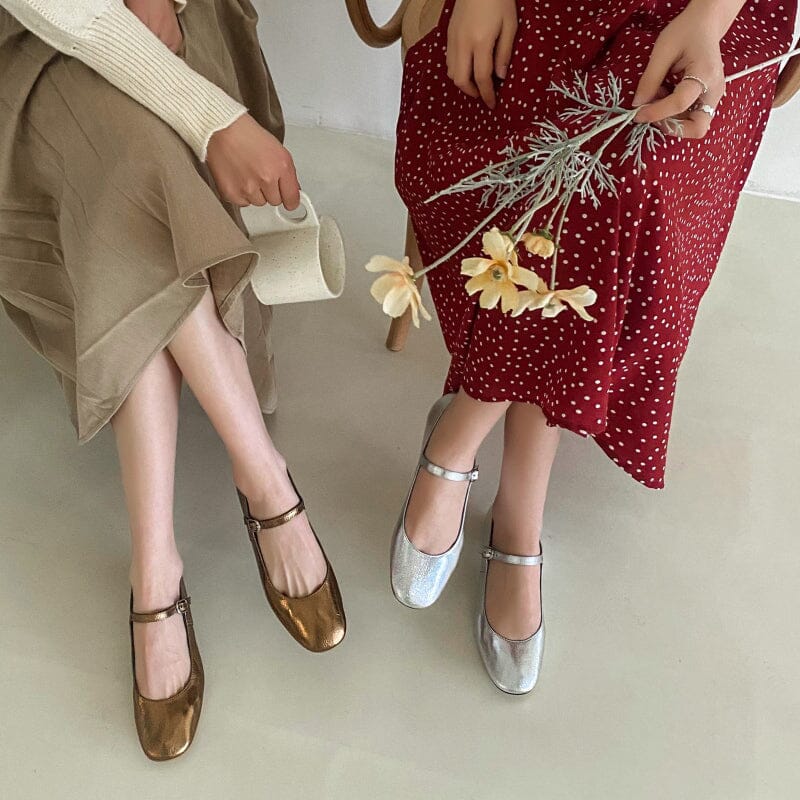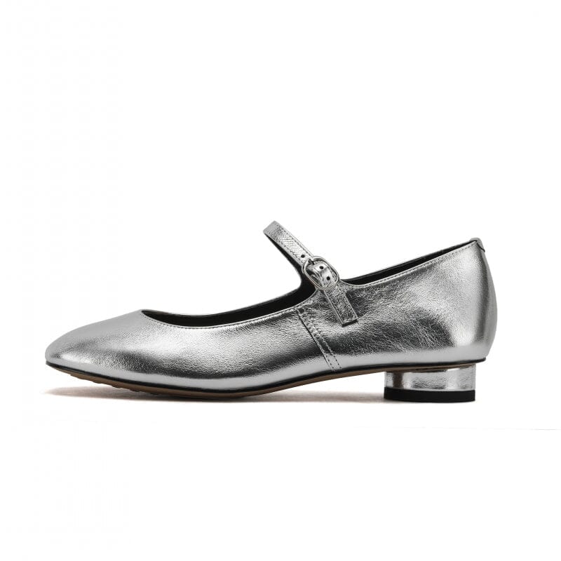 Leather Strappy Mary Jane Pumps Block Heel in Silver/Gold