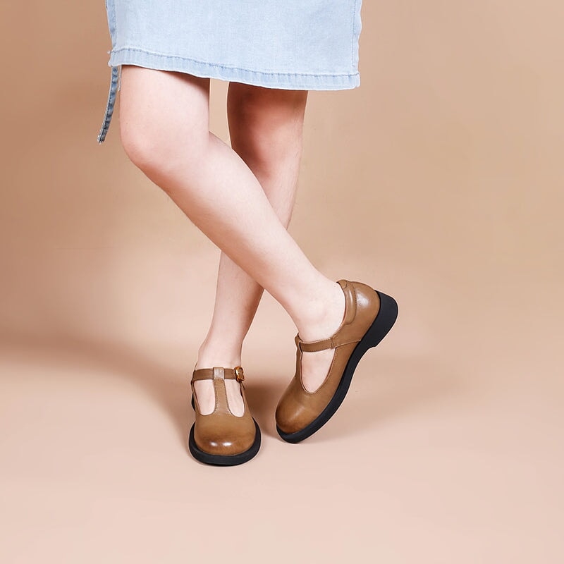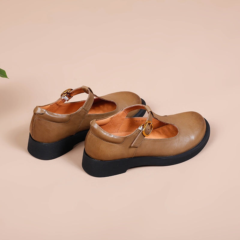 Handmade Retro Leather T Strap Mary Jane Shoes For Womens Round Toe Win Red/Black/Khaki