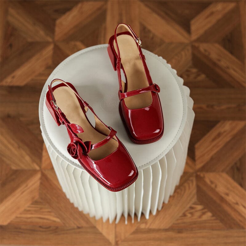 Patent Leather Slingback Mary Jane Pumps Block Heel in Red/Black