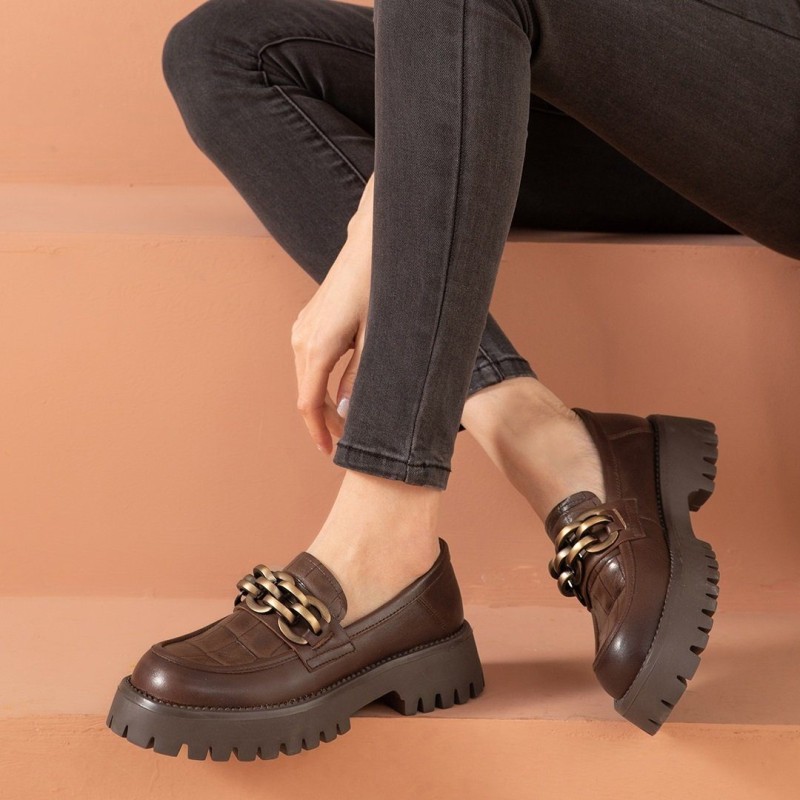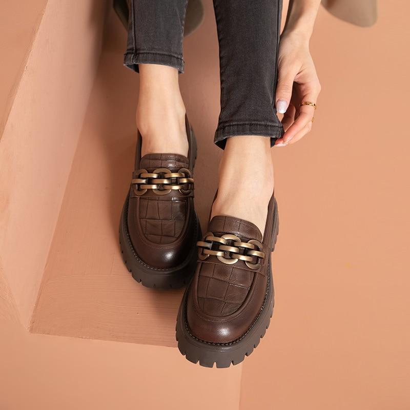 Chunky Loafers Women Genuine Cow Leather Platform Shoes Round Toe Metal Chain Slip on Ladies Flats Handmade