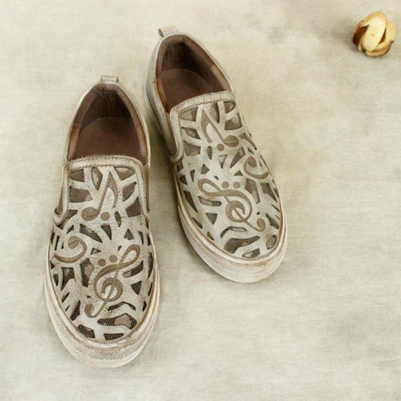 Hand-Printing Sneakers Women Calf Leather Low Wedge Walking Shoes Flats Black/Khaki