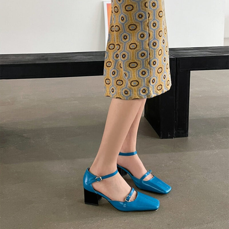 Handmade Leather Pumps Mid Heel Mary Jane Sandals Square Toe in Blue/Red
