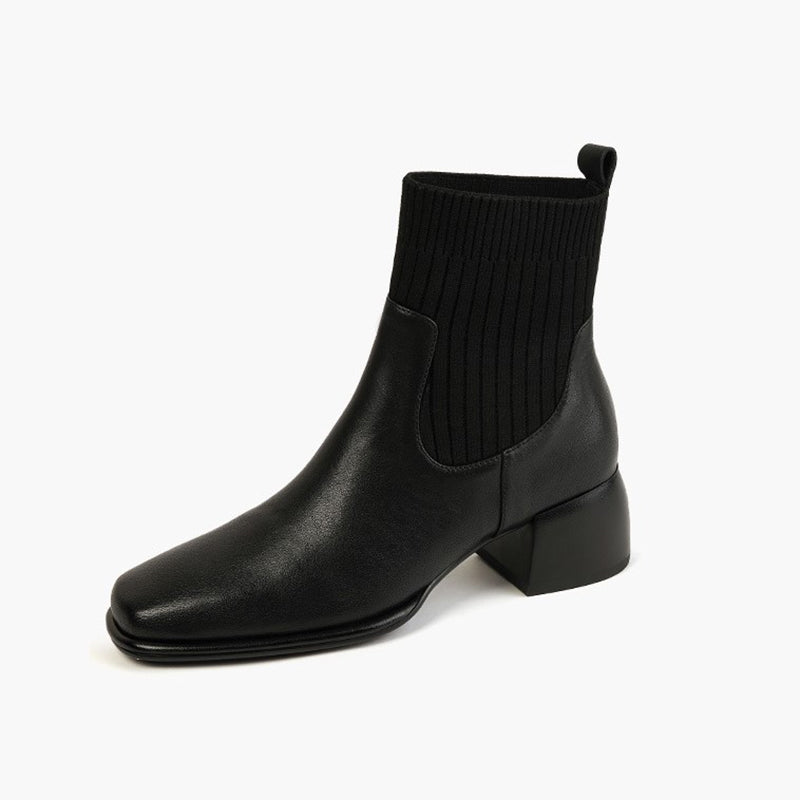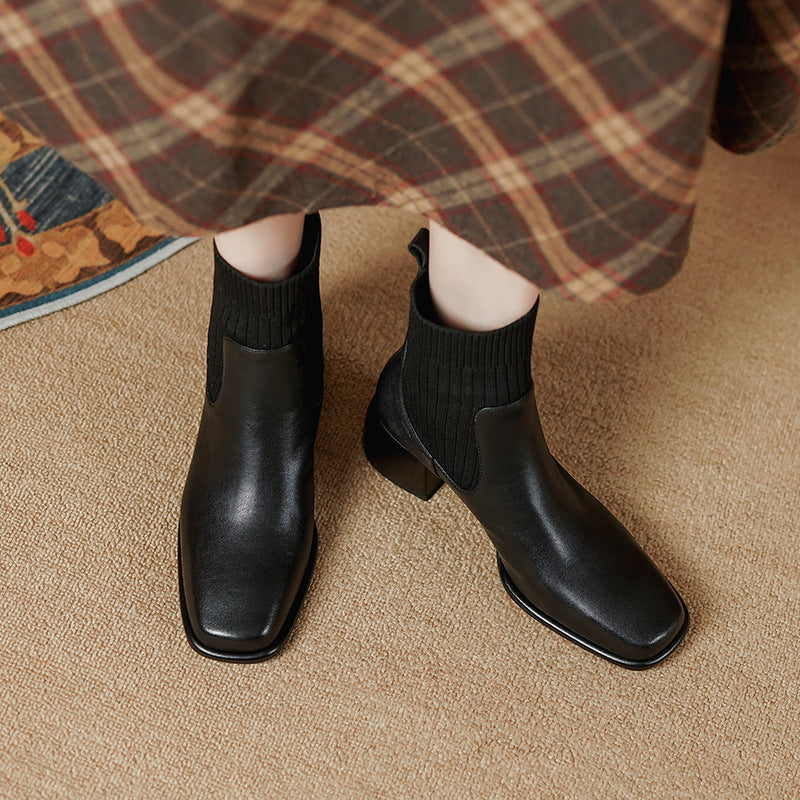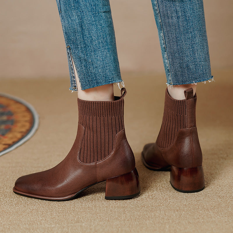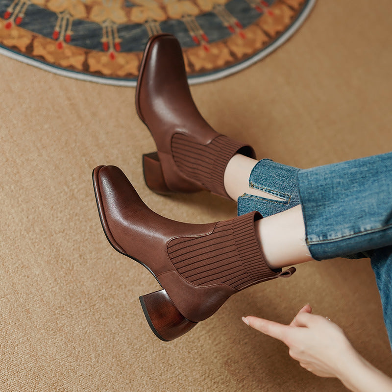 Classic Elegant Chelsea Boots Leather Stretch Boots Mid Heel Square Toe Sock Boots Brown/Black