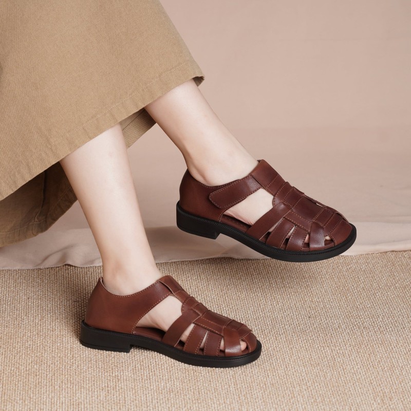 Designer Fisherman Shoes Genuine Leather Gladiator Sandals Soft Knit Retro Chunky Velcro Shoes Brown