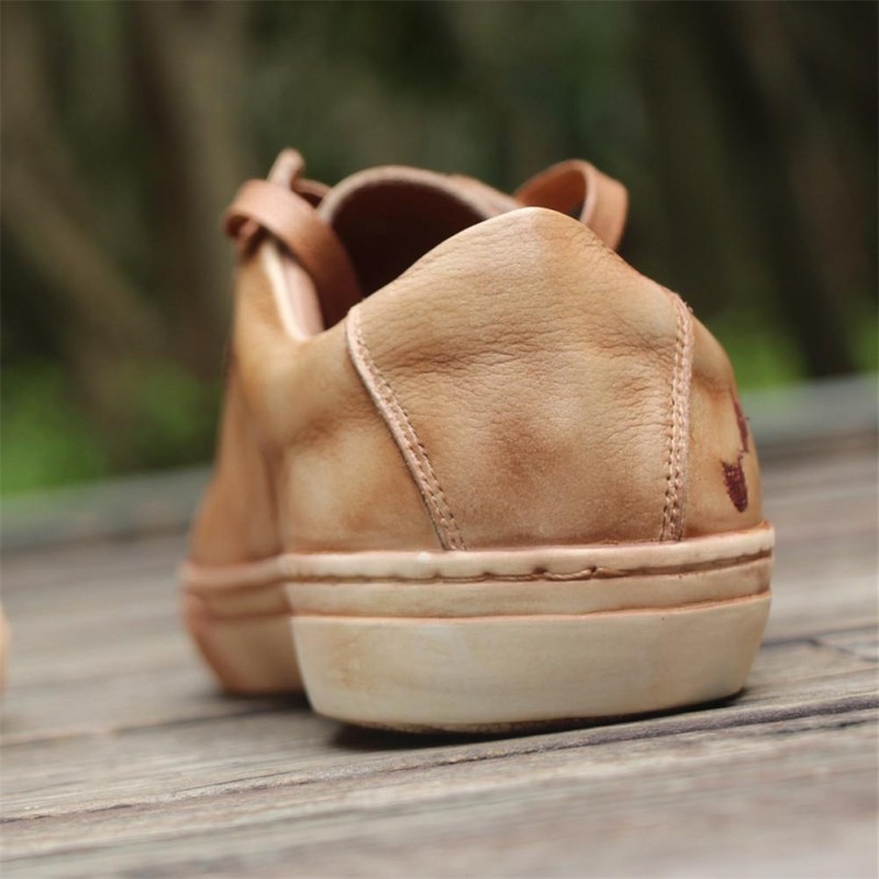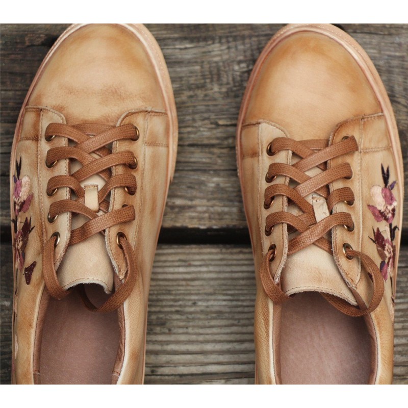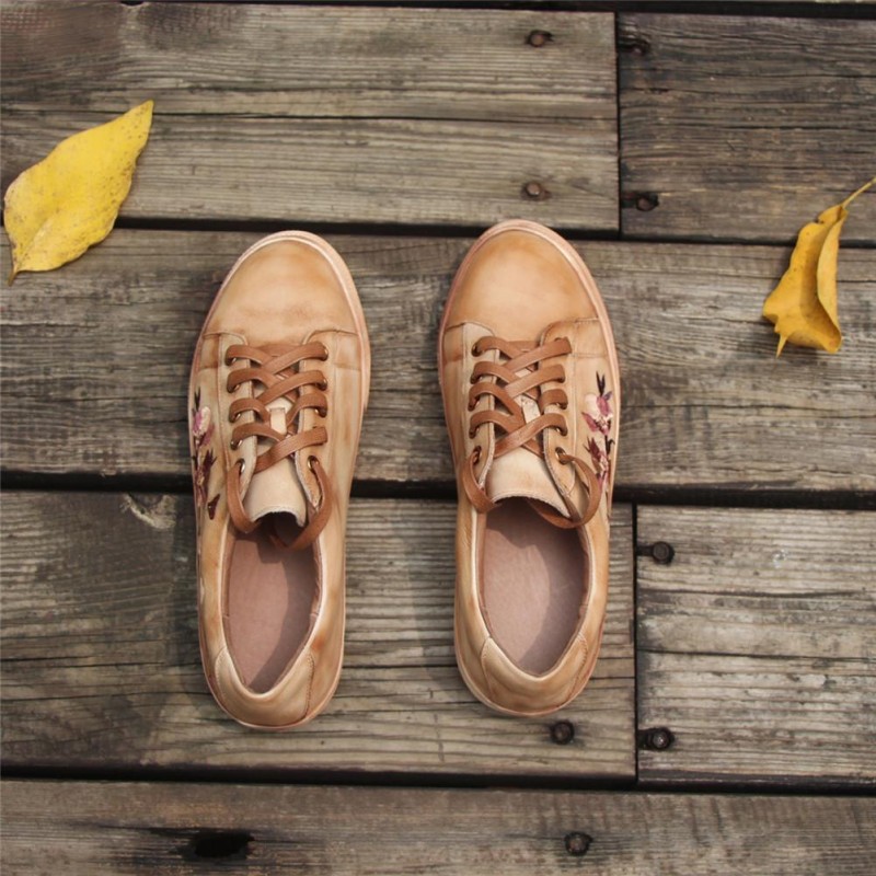 Handmade Women’S Low Top Fashion Leather Lace Up Sneakers Flower Embroidery