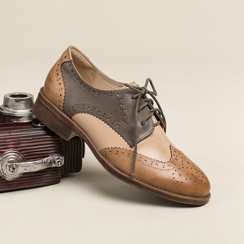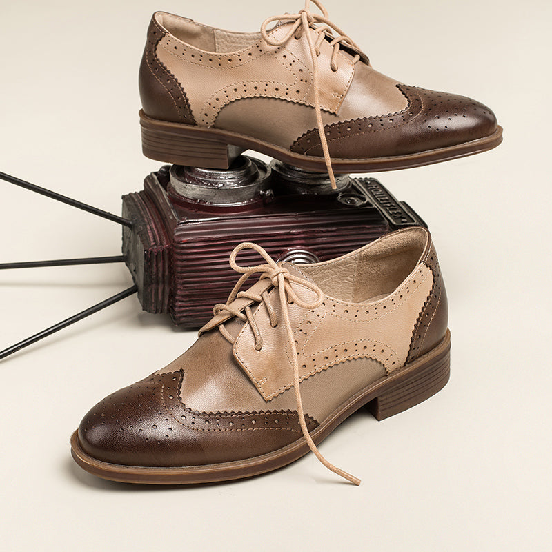 Women Wingtip Shoes Handmade Sheepskin Full Brogues Oxfords Low Heel Elegant Color Blocking(better suited for thin feet)
