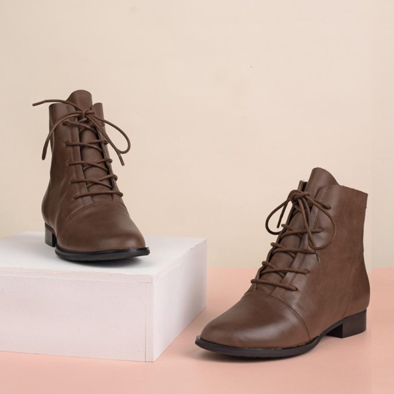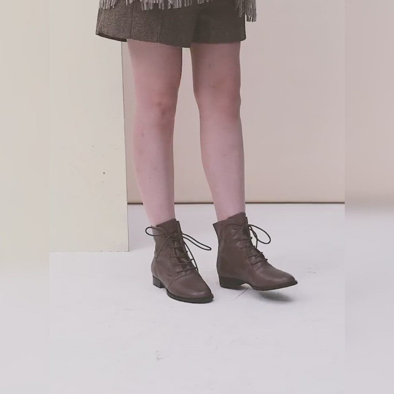 Comfortable retro British style ankle boots with soft calfskin leather uppers, non-slip flat rubber sole, deep and retro brown tone, simple but classic lace-up design.