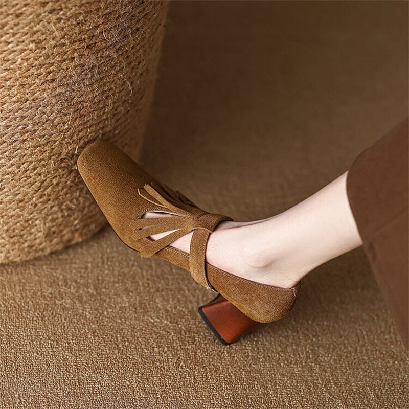 Handmade Suede Leather Pumps Mary Jane T Strap Square Toe Tassels Details in Black/Brown