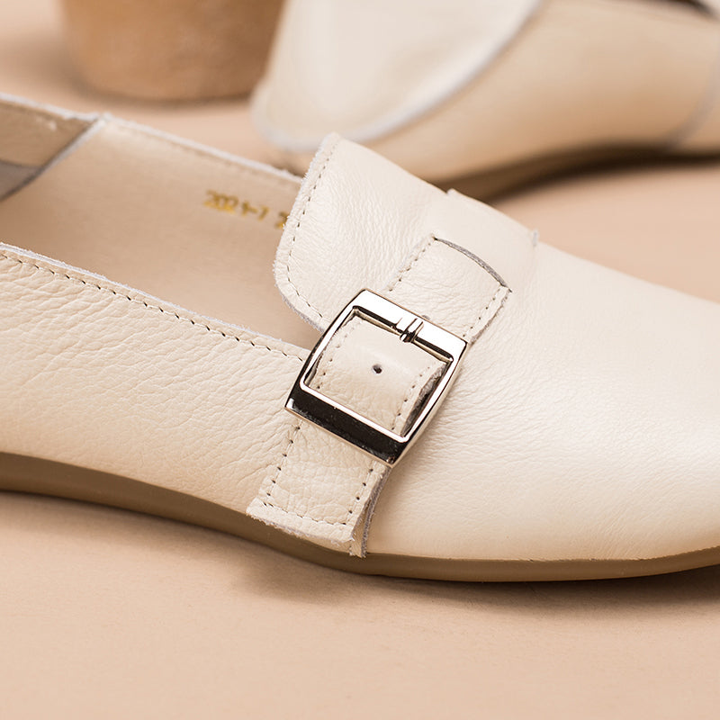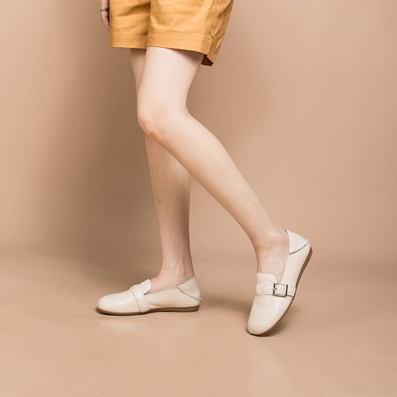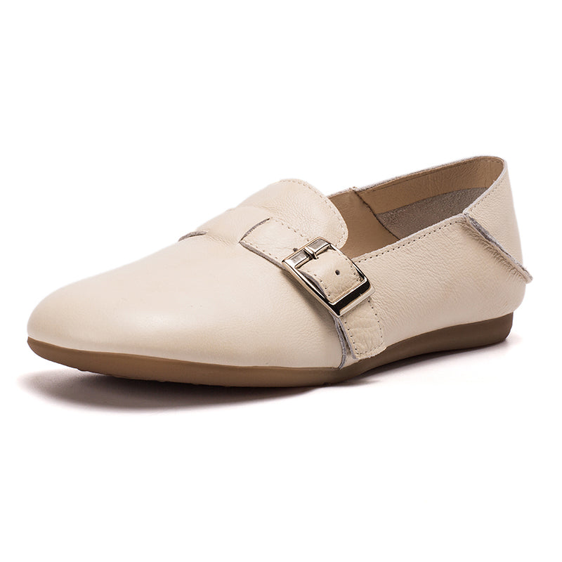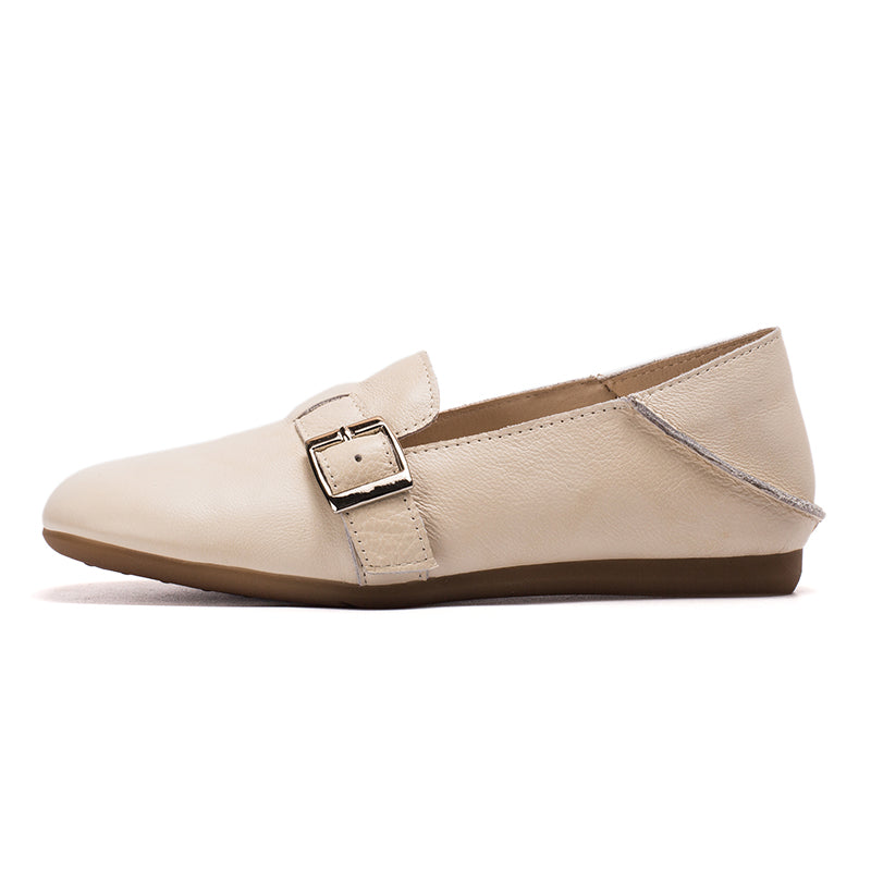 Soft Leather Flat Slip on Loafers for Women Buckle Details Handmade White/Apricot