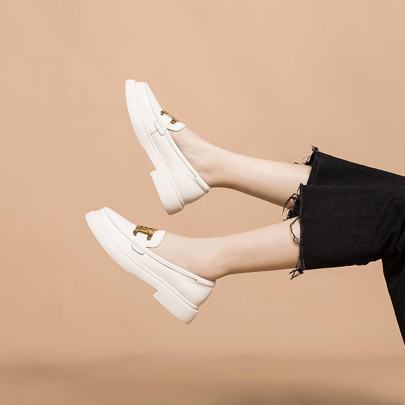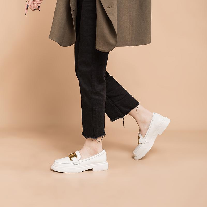 Matte leather Metal Buckle Loafers for Women Handmade Retro Square Heel Black/Beige