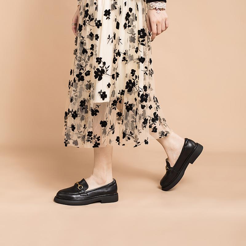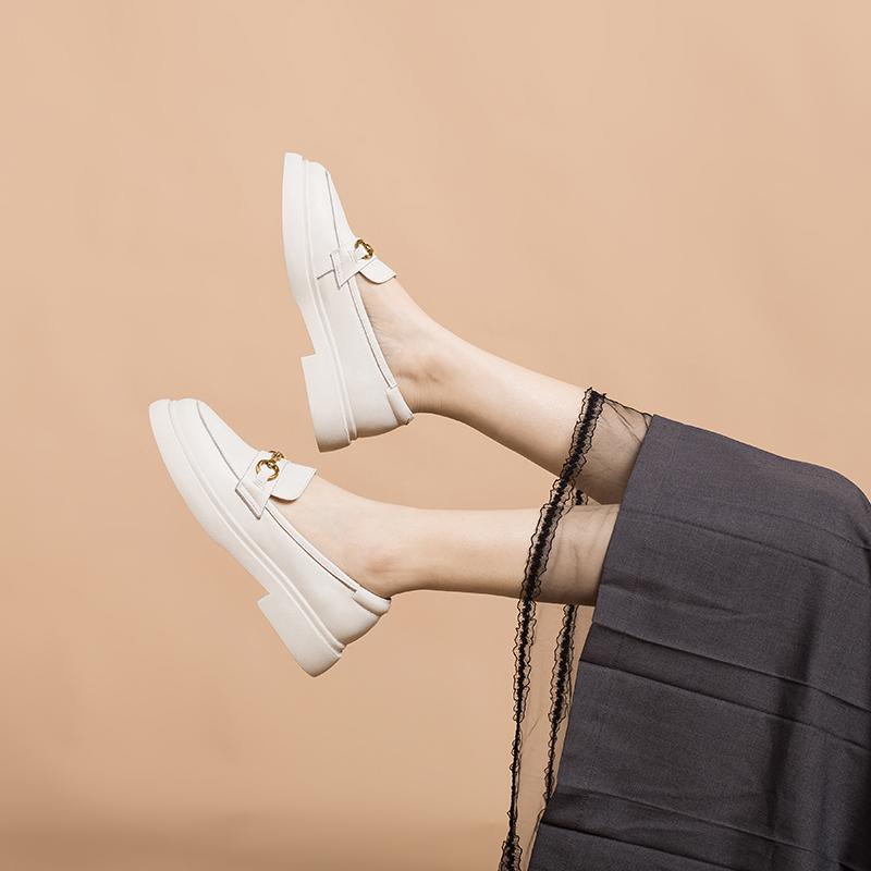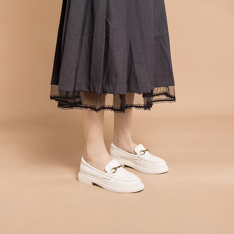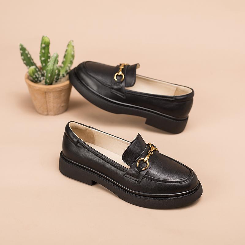 Womens Handmade Leather Loafers Metal button decoration Black/Beige