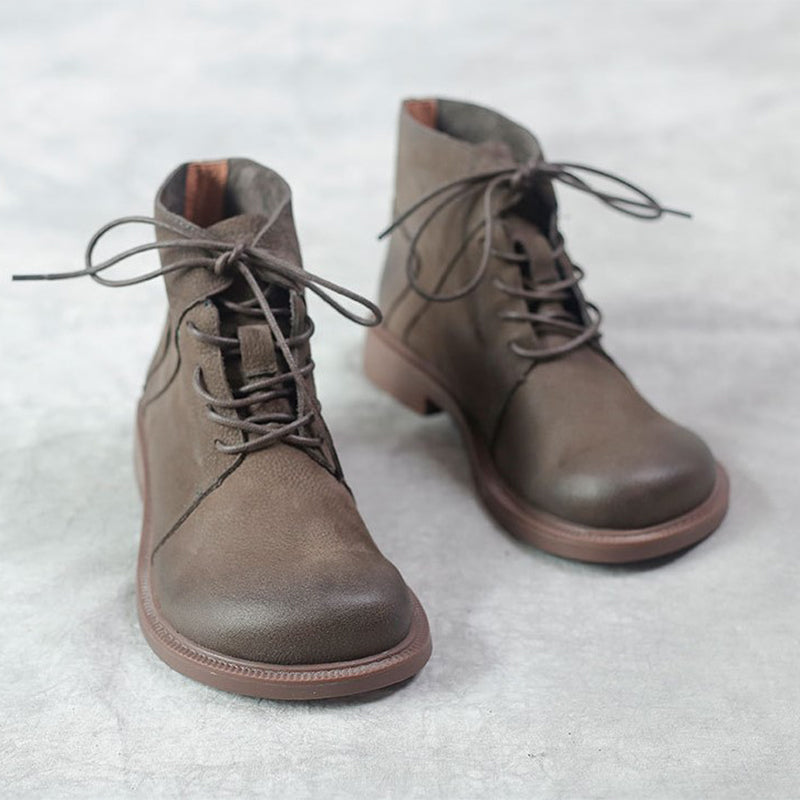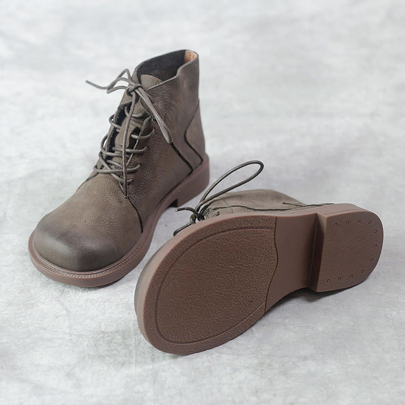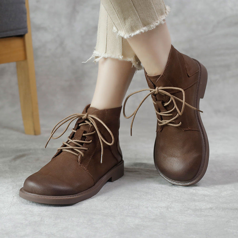 Wide Toes Handmade Genuine Leather Martin Boots Lace-Up Combat Boots Retro Chunky Ankle Boots