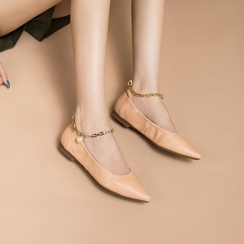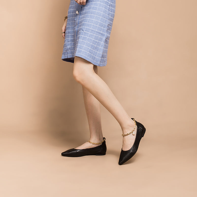 These Ballerina Shoes are modeled after classic Mary Jane styles and updated with the slim strap around the ankle instead of over the arch - it decorates with a detachable pearl chain.