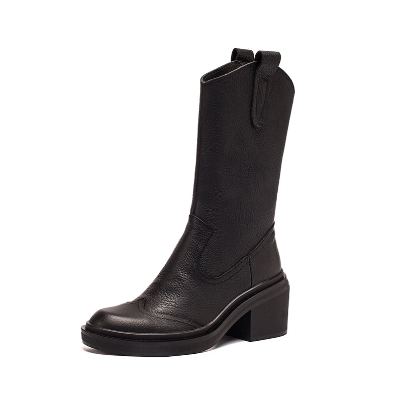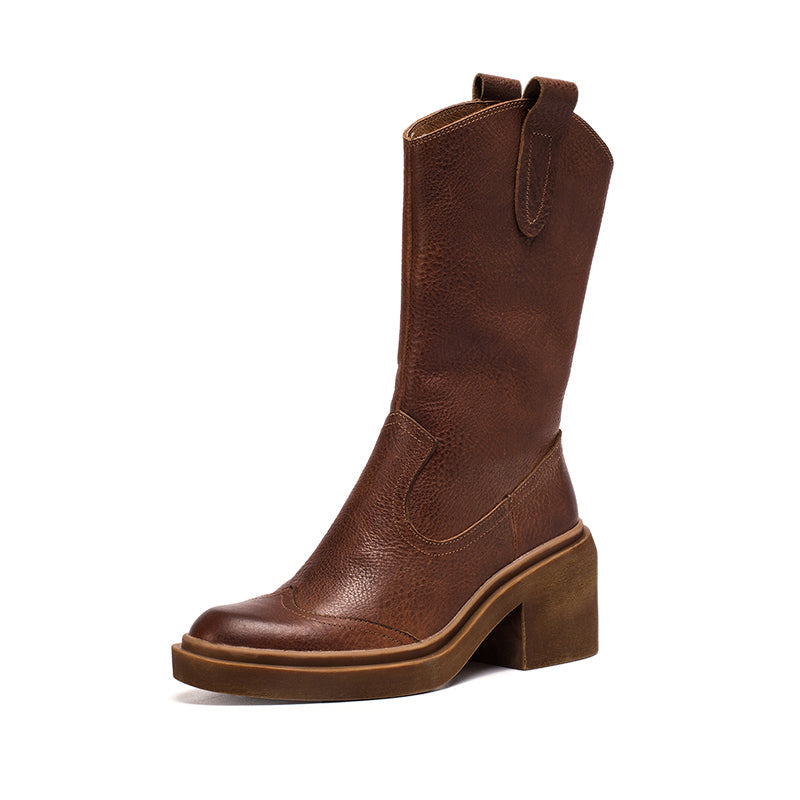 Leather Mid Calf Boots High Heel Cowboy Boots Designer Retro Chunky Riding Boots Handmade Short Plush Black/Brown