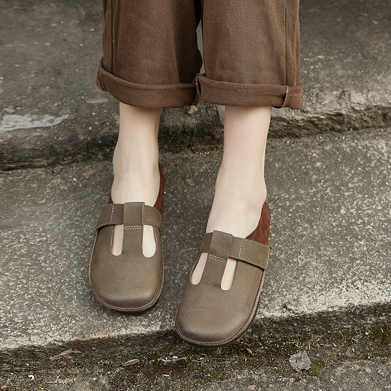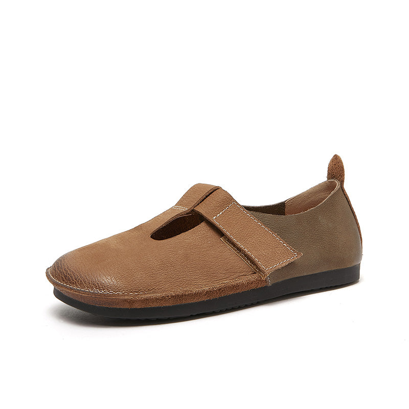Soft Leather Flat T Strap Mary Jane Shoes Round Toe in Brown/Coffee
