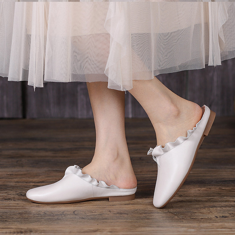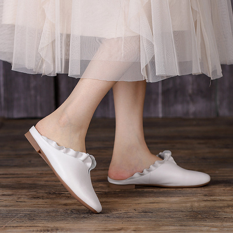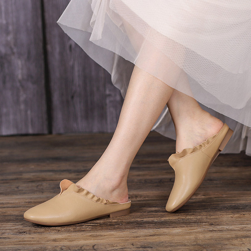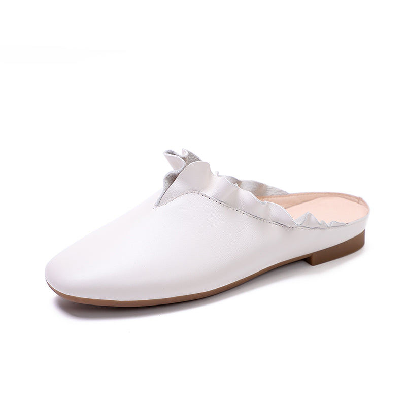Women'S Leather Slippers Loafers Sandals Round Toe Lightweight Flat Shoes Green/Khaki/Off white