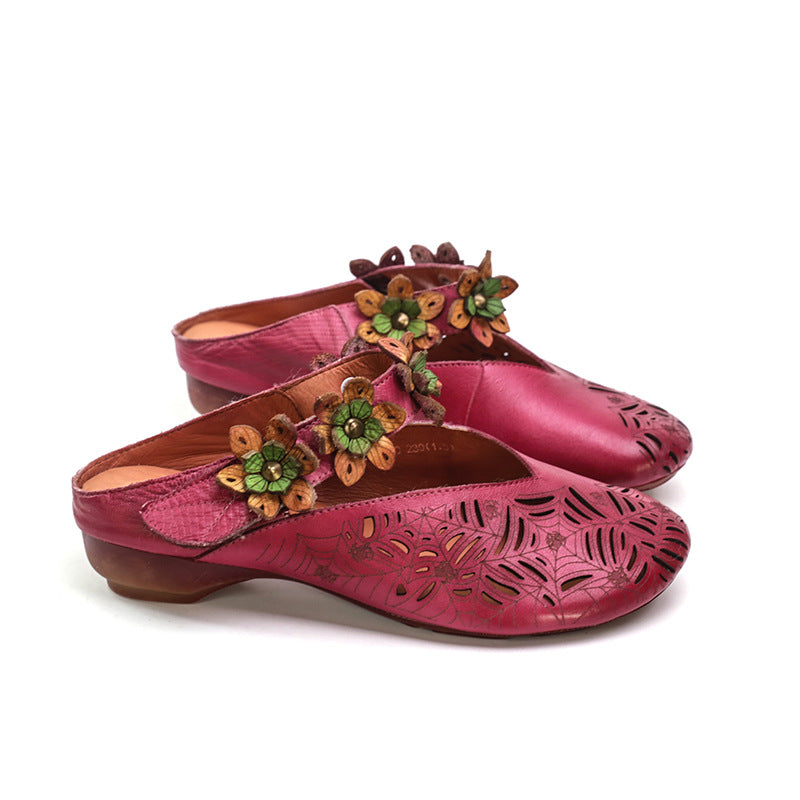 Retro Leather Slide Sandals Summer Slippers Handmade Mules Flowers Coffee/Purple