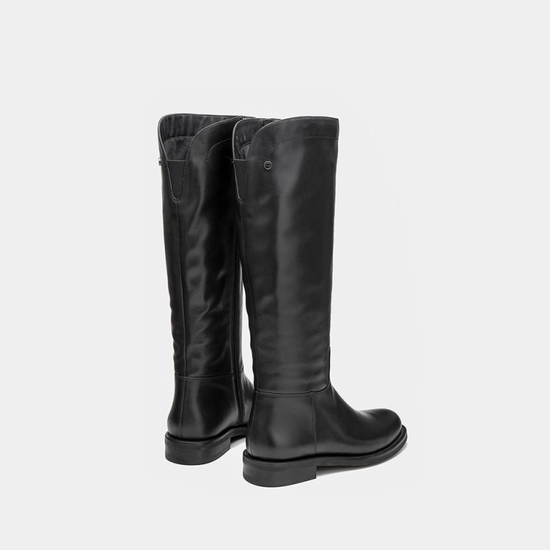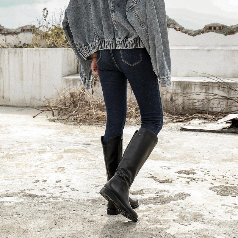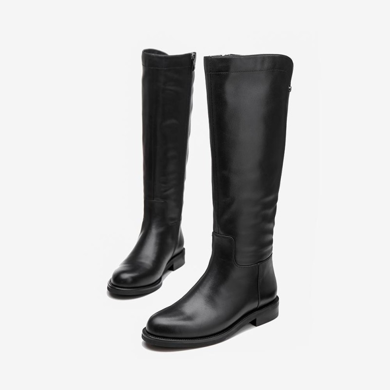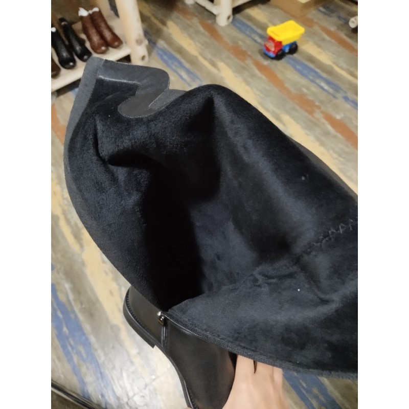 Handmade Soft Leather Knee High Boots Side Zip Riding Boots Black Short Plush