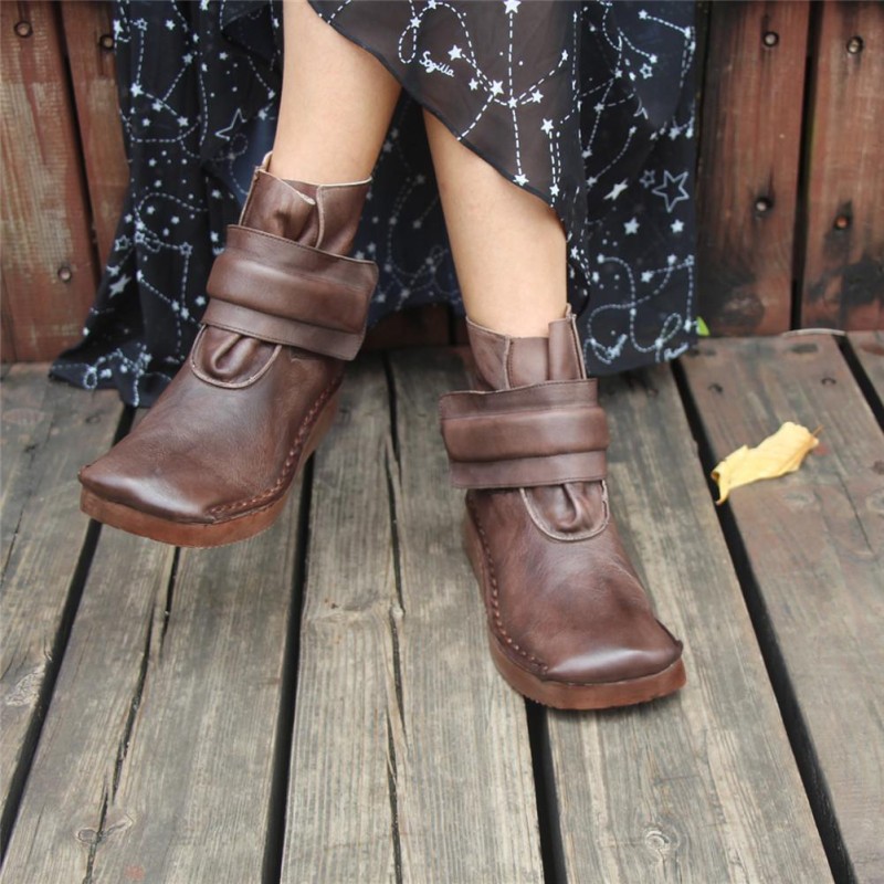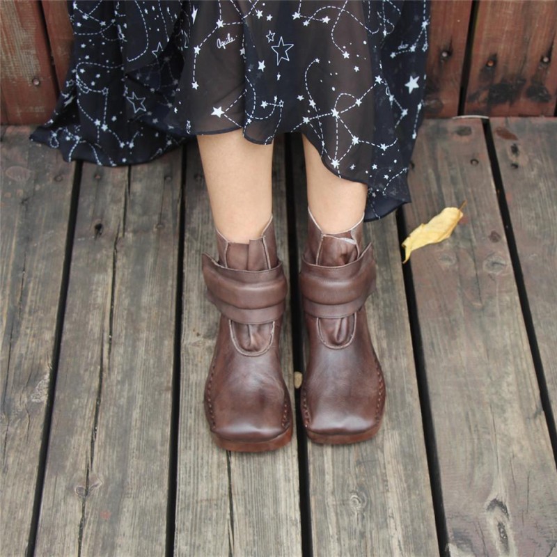 Women'S Handmade Retro Leather Ankle Boots Comfortable Walking Oxford Boots Square Toe Coffee