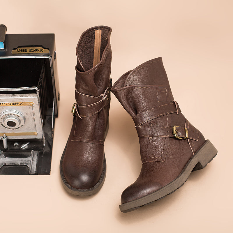 Womens Retro Leather Mid Calf Boots for Winter Buckles Boots Coffee/Brown/Black
